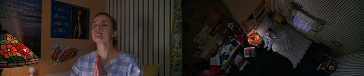 The night before the elections, all three students pray in their rooms. These individual scenes are each photographed in a similar manner; starting with a close-up and pulling up high with a crane shot that showcases their surrounding space. It's interesting to note that the use of space in these scenes is greatly exaggerated; obviously filmed in a studio, Alexander Payne pulls the shot as high as possible, distorting the size of their walls, which results in an illogical use of space.